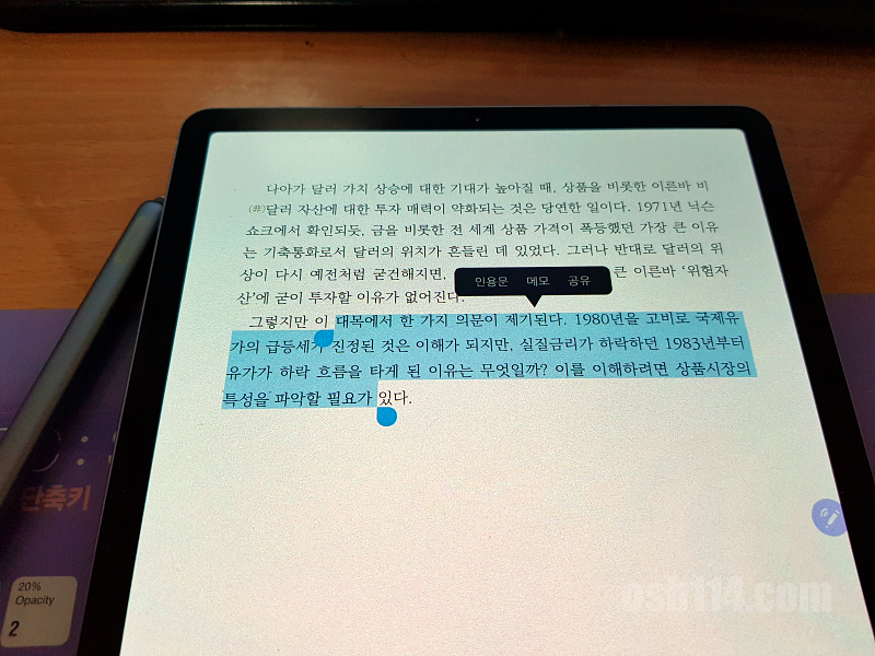 형광펜 기능도 불편합니다. 손가락의 터치를 제대로 인식하지 못해서 자꾸 다음 또는 이전 페이지로 넘어갑니다. 나중에야 글자를 누르고 밀어야 형광펜 기능을 쓸 수 있다는 걸 알게 되었지만, 지금도 종종 인용문 기능이 제대로 작동하지 않을 때가 있습니다.