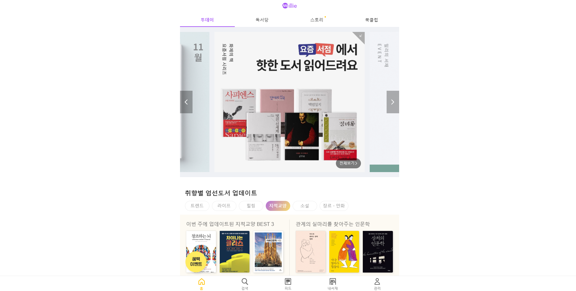 밀리의 서재 메인화면에 있는 카테고리는 아래와 같습니다.