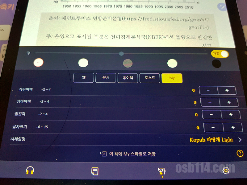 뷰어의 배경색, 글의 여백, 줄 간격, 글자크기, 서체 설정 등 웬만한 설정은 모두 가능하고 넘겨서 볼 건지, 스크롤로 볼건지 선택하는 것도 가능합니다. 그리고 본인만의 커스터마이징 한 설정을 읽고 있는 모든 책에 적용 가능합니다.