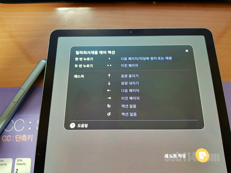 한번 누르면 다음 페이지, 두 번 누르면 이전 페이지로 가는 등의 조작이 가능했는데, 펜만 누르면 넘어가는 게 신기하고 편했습니다. 가만히 앉아서 펜만 누르면 알아서 넘어가서 편하게 읽을 수 있었습니다.