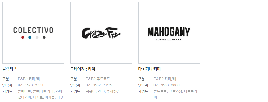 | 콜렉티보 | 02-2678-5221 | 스페셜티커피, 디저트, 마카롱 |