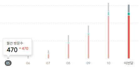 위 그래프는 제 사이트의 방문자 그래프입니다. 맨 왼쪽이 5월 방문자수인데, 470명이었습니다. 그리고 저때는 티스토리가 자가 방문도 통계에 넣었기 때문에, 실제로 블로그에 들어온 사람은 300명도 안되었을 겁니다.