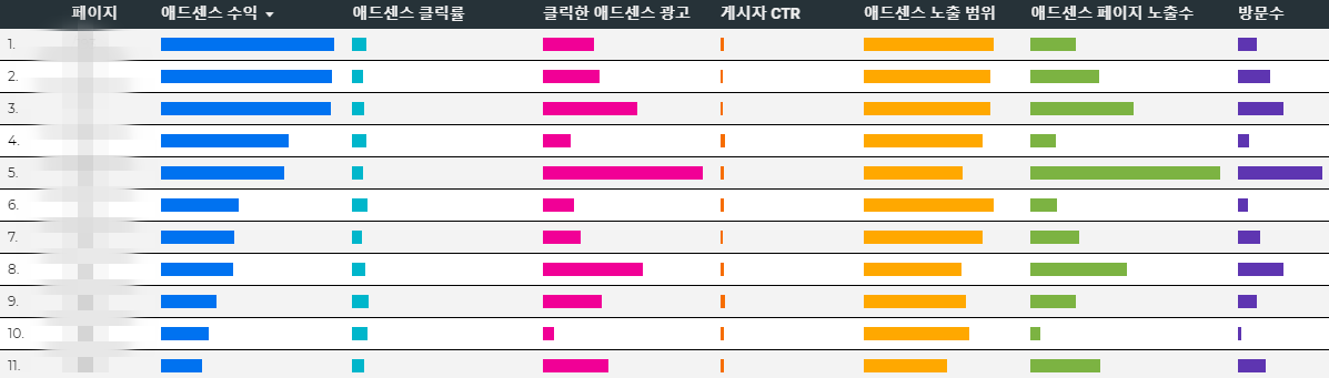 이걸 보면 어떤 글들이 방문자 수 대비 수익이 좋은지 알 수 있습니다. 그리고 그걸 토대로 자신만의 블로그 글쓰기 전략을 짤 수 있습니다. 이때 전 방문자수의 증가가 애드센스 수익에 큰 영향을 미치지 못한다는 걸 알았습니다. 그래서 방문자수보단 좋은 키워드 위주로 글을 쓰고 있습니다.