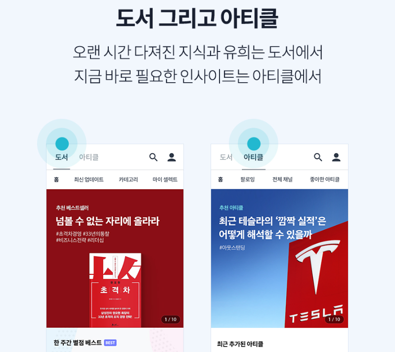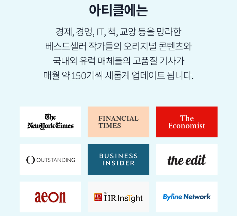 아티클은 가볍게 읽을 수 있는 글들을 제공합니다. 기존의 도서들은 한 권씩이라 읽는 데 부담을 느끼는 사람들을 위해 10분 정도면 읽을 수 있는 기사 또는 글을 제공합니다. 웹소설과 비슷하다고 볼 수 있습니다.