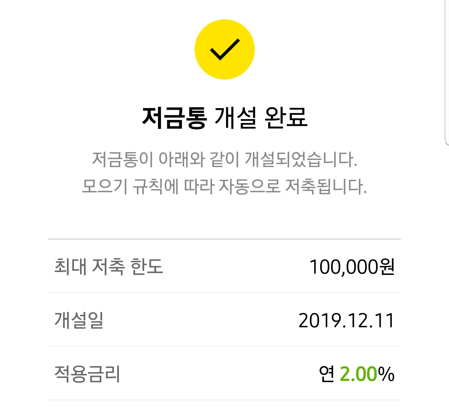 카카오 뱅크 저금통의 최대 저축 한도는 10만원이고, 적용금리는 세전 2.0%입니다.