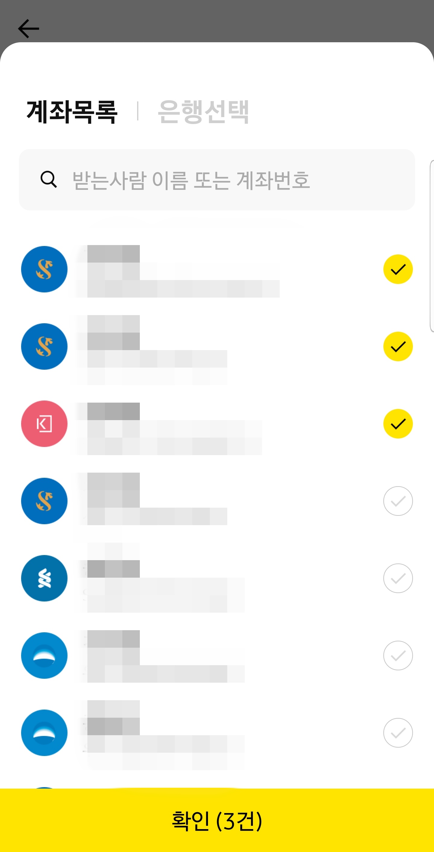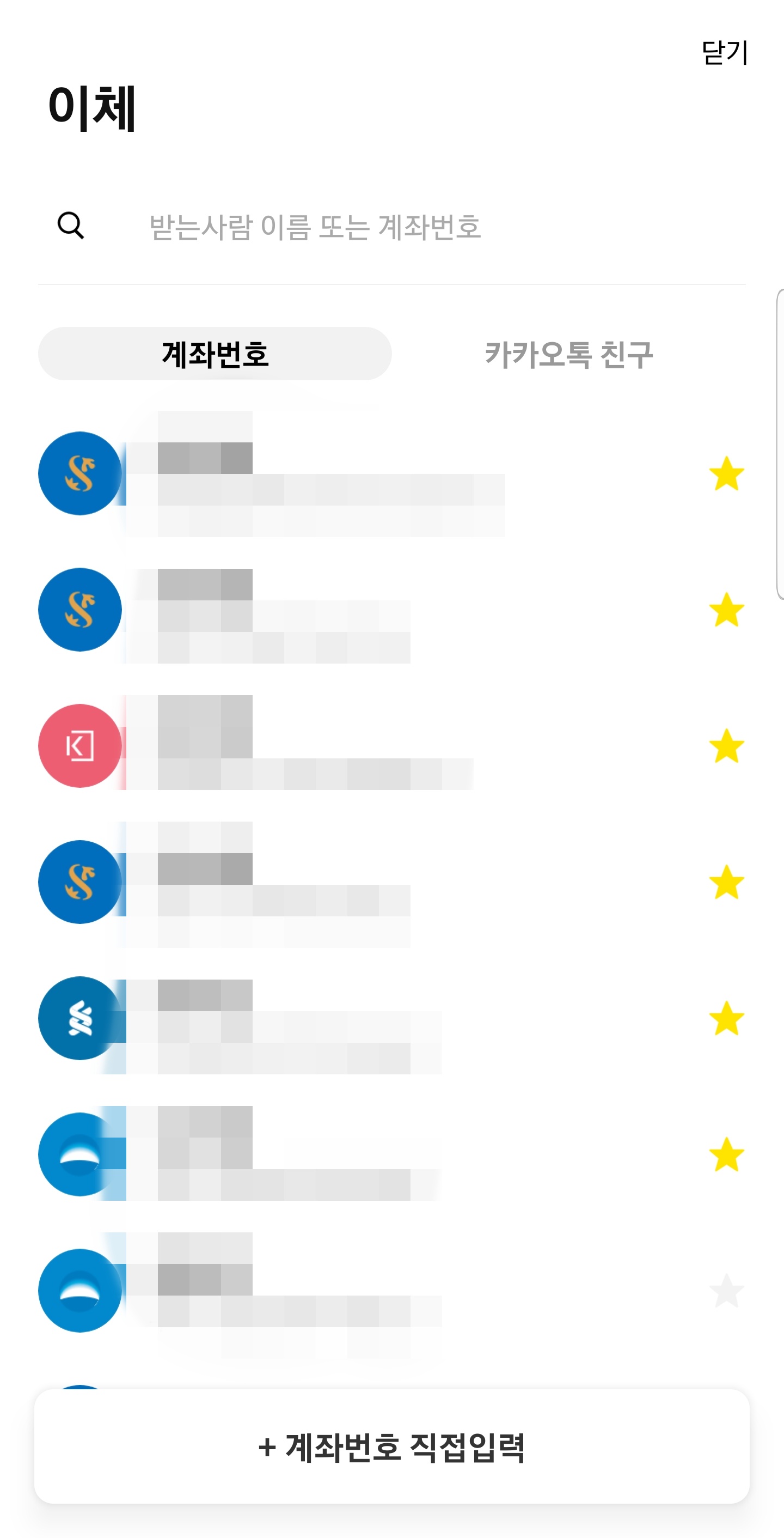 그래서 탭으로 계좌와 카톡 친구를 오갈 수 있고, 통합 검색도 가능합니다.