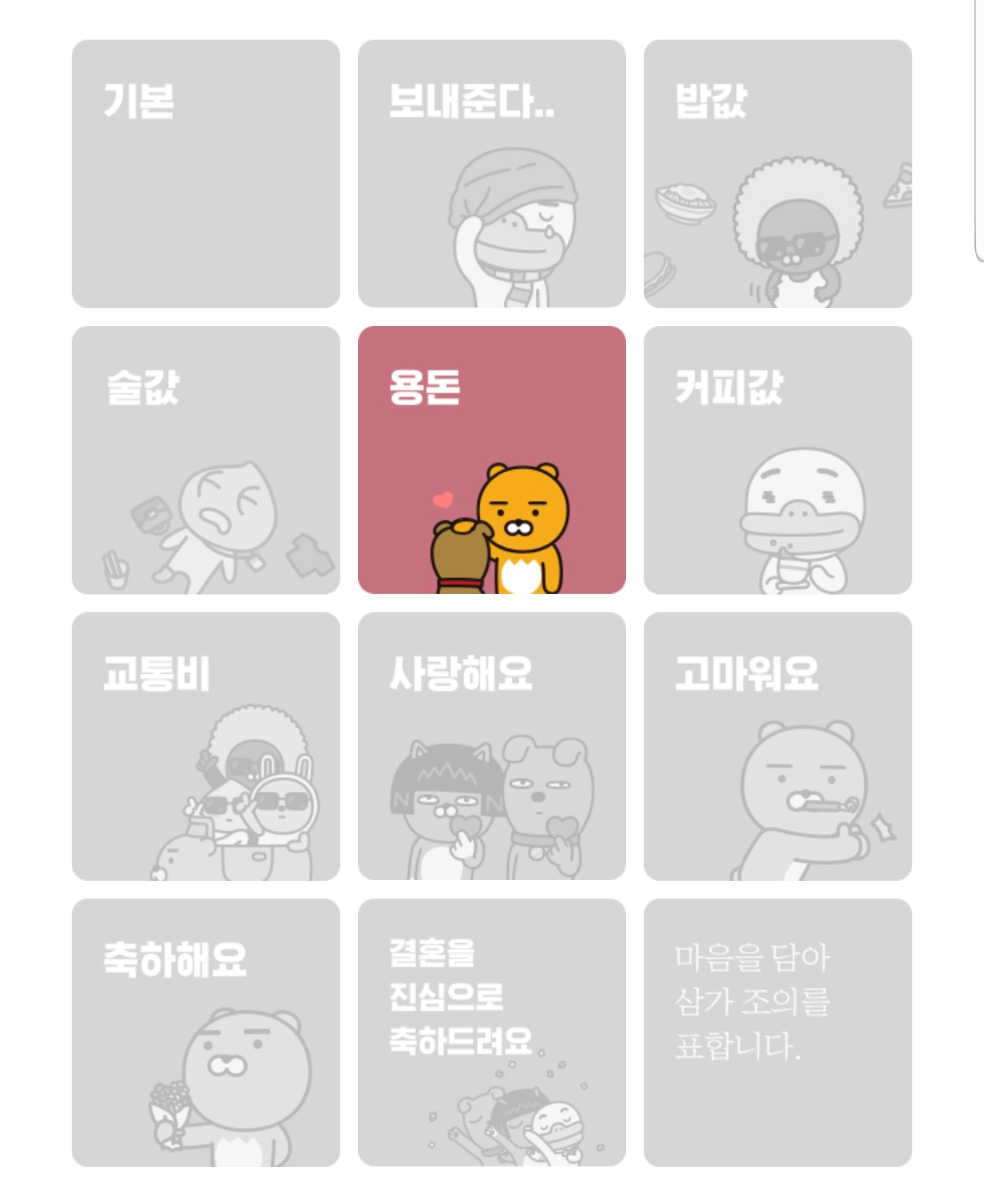 카톡으로 이체를 할 때 메시지 카드를 보낼 수 있었는데요, 이 메시지카드 수가 늘어났습니다.