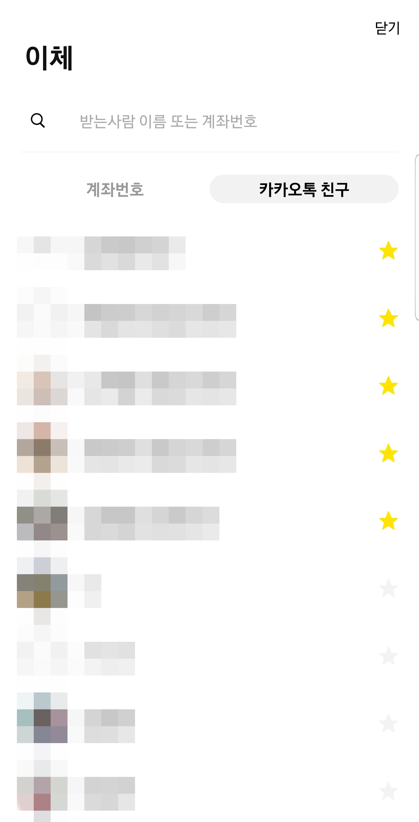 그래서 탭으로 계좌와 카톡 친구를 오갈 수 있고, 통합 검색도 가능합니다.