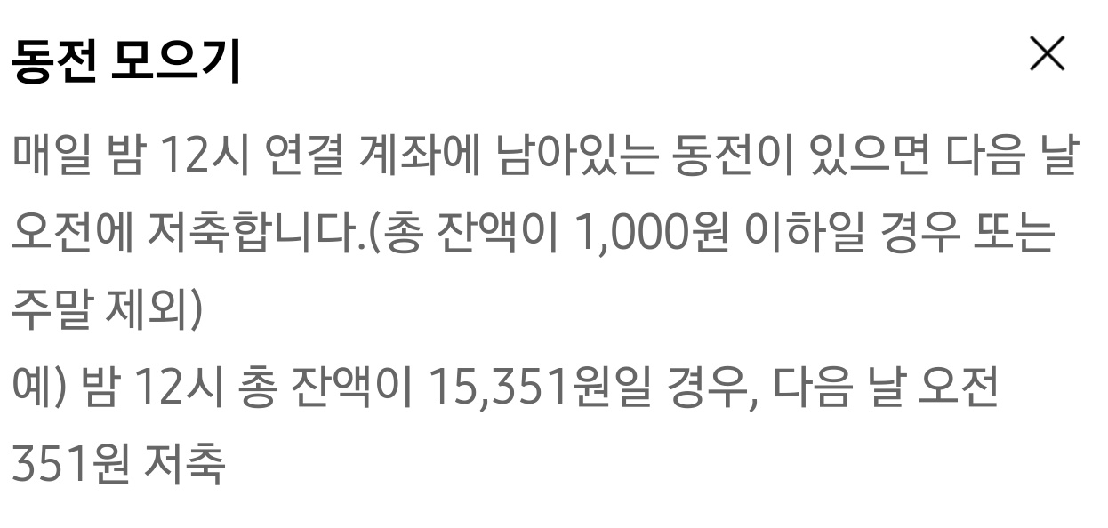 저금통에서 동전은 1,000원 이하의 잔돈을 저축하는 방식입니다. 예를 들어 계좌에 15,351원이 있다면 다음날 오전에 351원이 저축되는 방식입니다. 그러므로 잔액이 1,000원 이하인 경우 동전을 모을 수 없습니다.