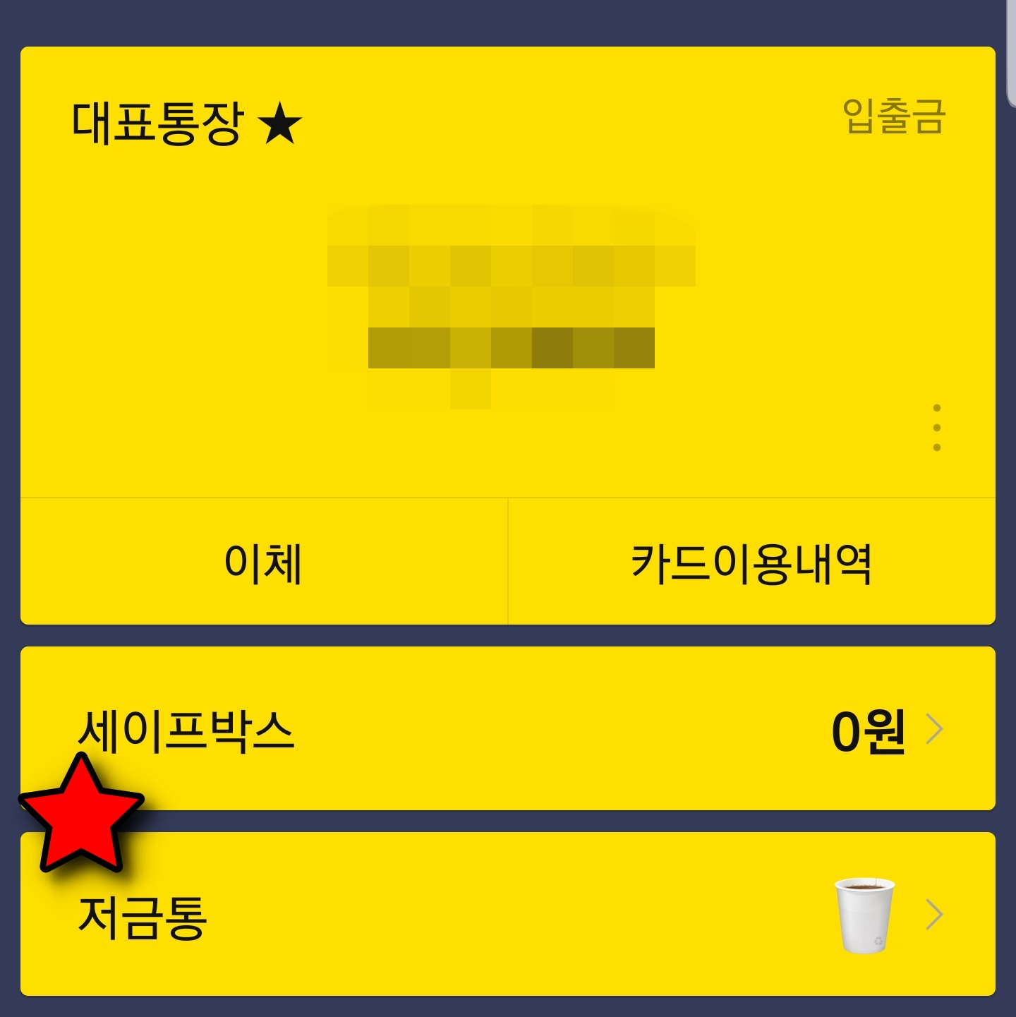 카카오 뱅크 저금통을 개설하면 메인화면 세이프박스 아래에 저금통 메뉴가 활성화됩니다. 저금통 오른쪽에는 금액 대신에 저축된 금액에 해당하는 그림이 있습니다. 이 그림으로 현재 저금통에 얼마만큼의 금액이 들어있는지 유추할 수 있습니다.