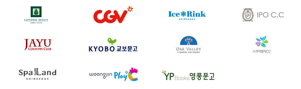 CGV(광주터미널, 죽전, 센텀시티, 영등포, 대전터미널, 의정부점) 한솔 오크밸리, 가평/안양 베네스트, 아포 CC, 자유 CC, 신세계 샌텀시티 스파랜드, 신세계 샌텀시티 아이스링크, 영풍문고, 교보문고, 웅진 플레이도시, 스카이밸리 CC