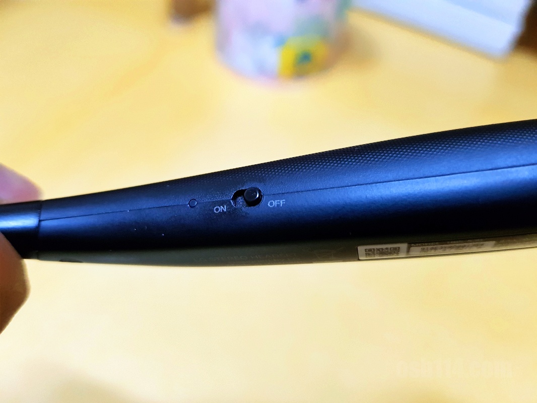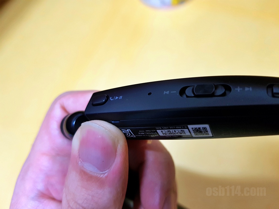 HBS 830의 조작 버튼은 왼쪽에 쏠려 있습니다. 넥밴드 왼쪽 바깥쪽에 통화버튼, 음량 조절과 다음 곡 이동이 가능한 조그 버튼, USB 충전 단자가 있습니다. 안쪽에는 전원 on/off버튼이 있습니다.