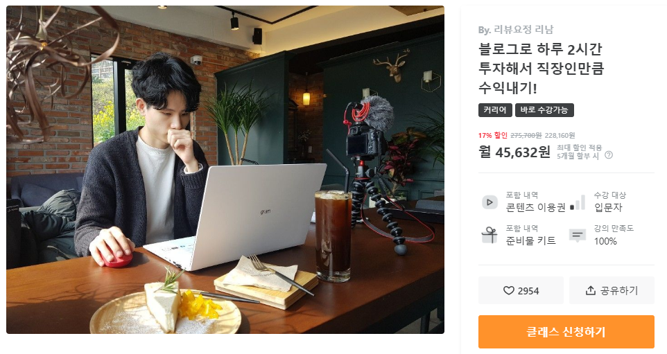 저는 수익형 블로그 강의를 듣고 있습니다. 리뷰요정 리남이라는 분이 진행하는 수익형 블로그 강의입니다. 블로그를 운영하면서 소소한 수익을 챙기고 있지만, 부업으로서 블로그를 좀 더 잘 운영해보고 싶은 마음에 신청했습니다.