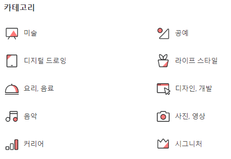 그림 그리기에서부터, 사진, 공예, 요리, 디자인, 음악, 부업 등 다양한 카테고리의 강의를 선보이고 있습니다.