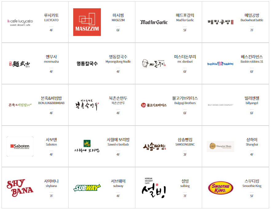 | 명동칼국수 | 테이스트파크4F | 11:00 ~ 22:00 | 02-2012-0404 | 칼국수, 만두 |