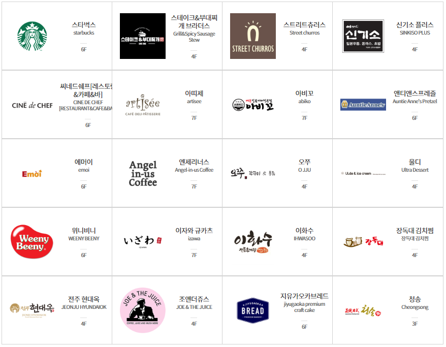 | 케이에프씨 | 테이스트파크6F | 10:00 ~ 22:00 | 02-2012-0641 | KFC, 패스트푸드 |
