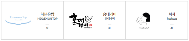 | 희차 | 테이스트파크4F | 09:00 ~ 22:00 | 02-2012-0432 | 차, 크림치즈, 카페 |