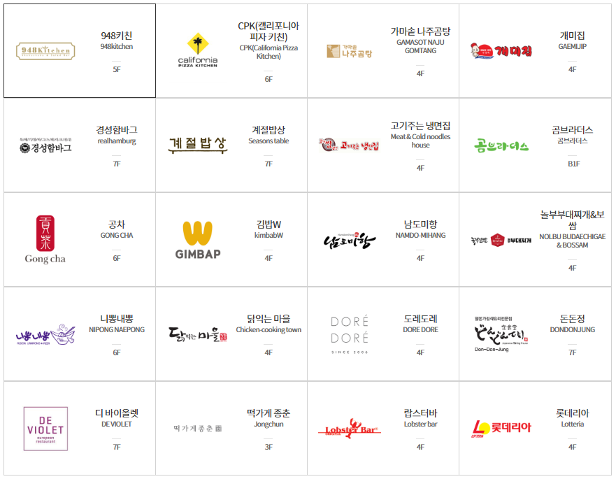 | 948키친 | 테이스트파크5F | 11:00~22:00 | 02-2012-0948 | 샤브샤브 |