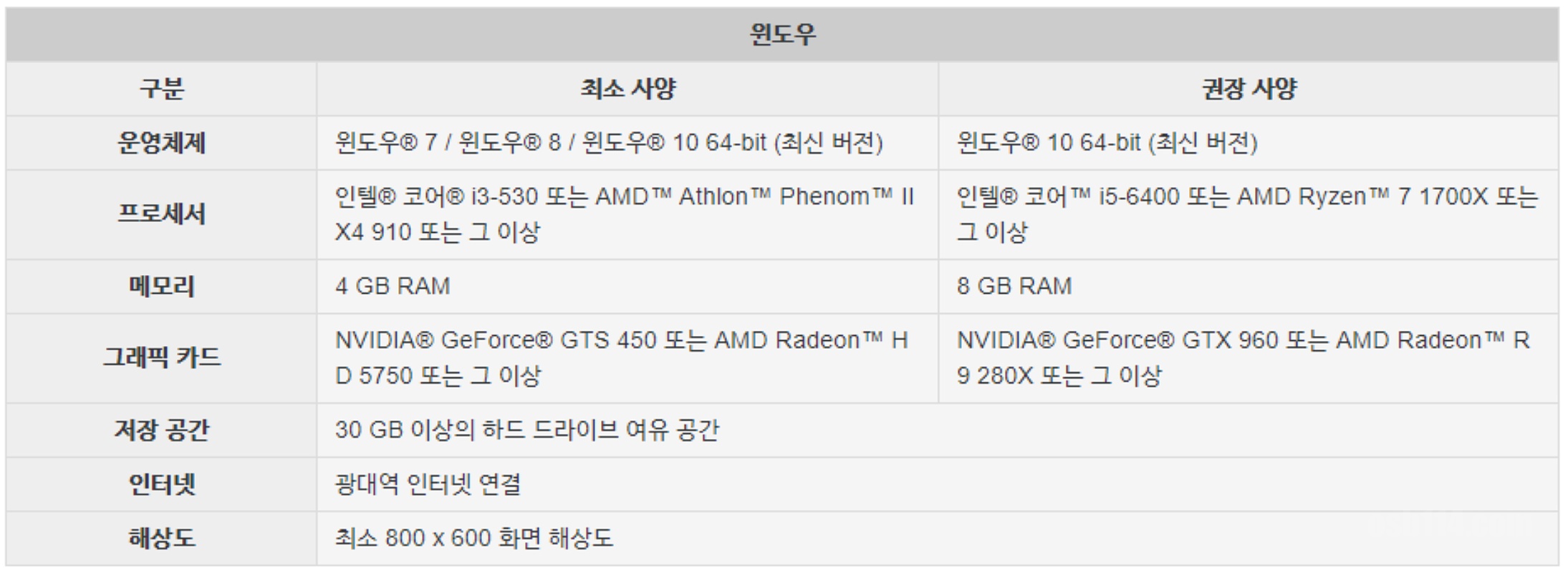 사양은 그렇게 높은 편은 아닙니다. 리마스터를 하긴 했지만, 기본 엔진이 오래되어서 그런 것 같습니다. 하지만, 게임 엔진이 오래된 탓에 멀티코어 CPU를 제대로 지원하지 못하는 현상이 발생하고 있습니다. 대규모 전투나, 화면이 화려해지고 이펙트가 많아지면 프레임이 떨어지는 현상이 발생한다고 합니다.