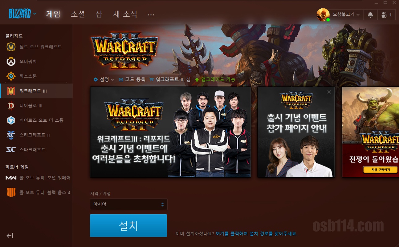 PC방에는 워크래프트 3 리포지드는 설치되어 있지 않았습니다. 그래서 그냥 설치를 눌러 설치를 시작했습니다. 용량은 30GB내외 였지만, PC방 인터넷 속도가 빨라서 다운 후 설치까지는 그리 오래 걸리지 않았습니다. 저번에 콜 오브 듀티 모던 워페어 때의 참사는 일어나지 않았죠. 그떄 관련 된 글은 하단 링크에 첨부해 두었습니다.