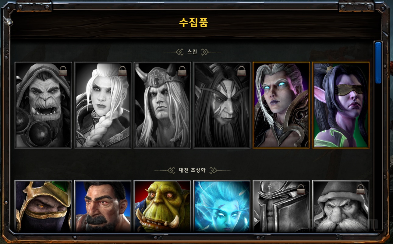 메뉴 중에 수집품이 있어서 들어갔더니, 초상화들이 보였습니다. 리스트를 보니, 캠페인을 다 깨거나 밀리에서 승리하면 보상으로 제공하는 것 같습니다. 특정 영웅도 있는 걸 보니 실제 플레이하는 영웅의 스킨을 바꿀 수 있는 것이었습니다. 쓰랄, 제이나, 아서스, 데스 나이트, 일리단 등이 있었습니다.