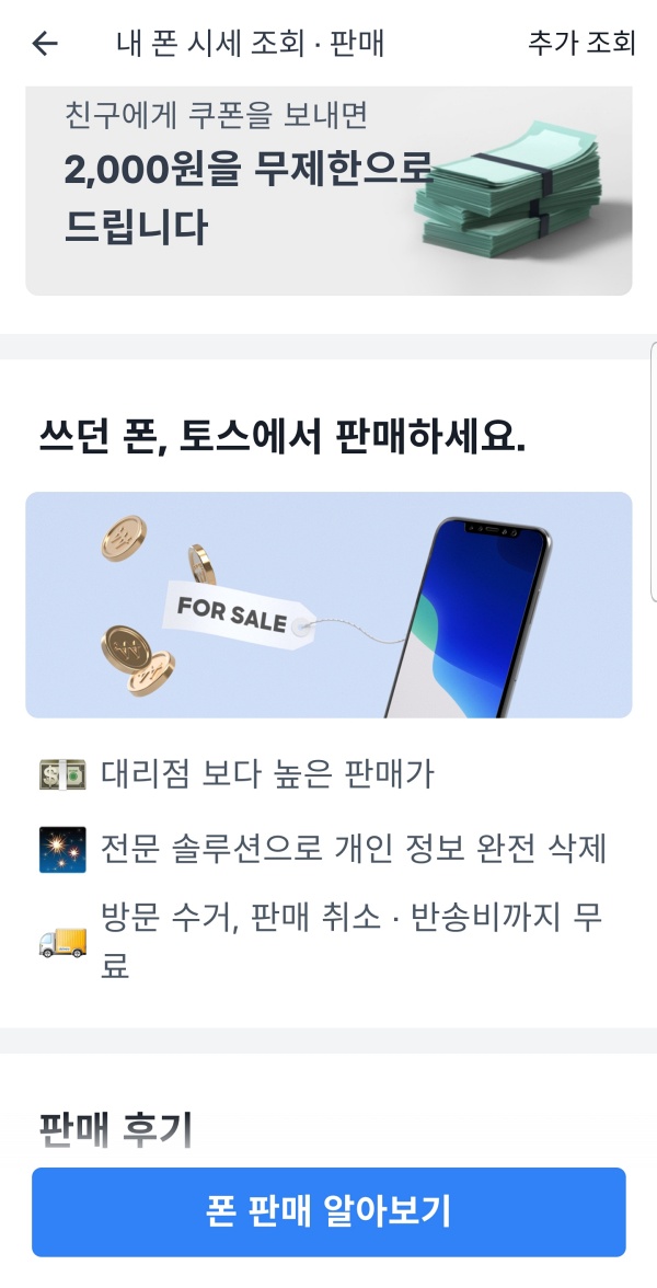 토스에서도 그런 점을 캐치했는지, 얼마 전부터 토스에서도 중고폰을 판매할 수 있는 메뉴가 생겼습니다.