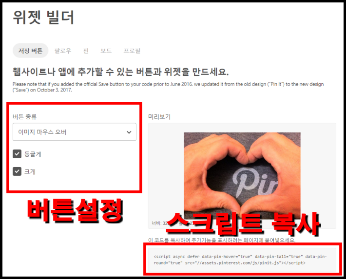 2. 핀터레스트 위젯 빌더에서 스크립트를 복사합니다.