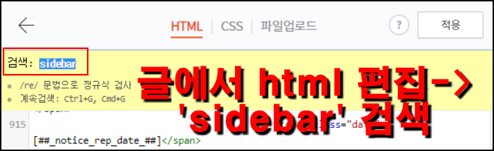 ▲ 글에 가서(홈 아닙니다) html편집으로 갑니다. Ctrl + F 를 누르고 sidebar 를 찾습니다.