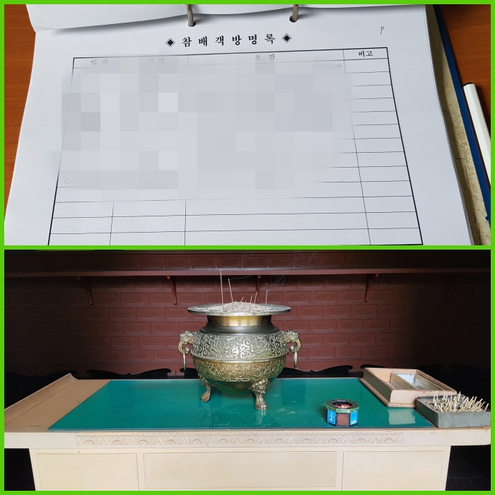방명록에는 방문객들의 이름과 간단한 글이 적혀있습니다. 향도 하나 피웠습니다.