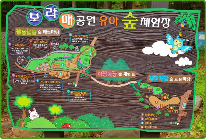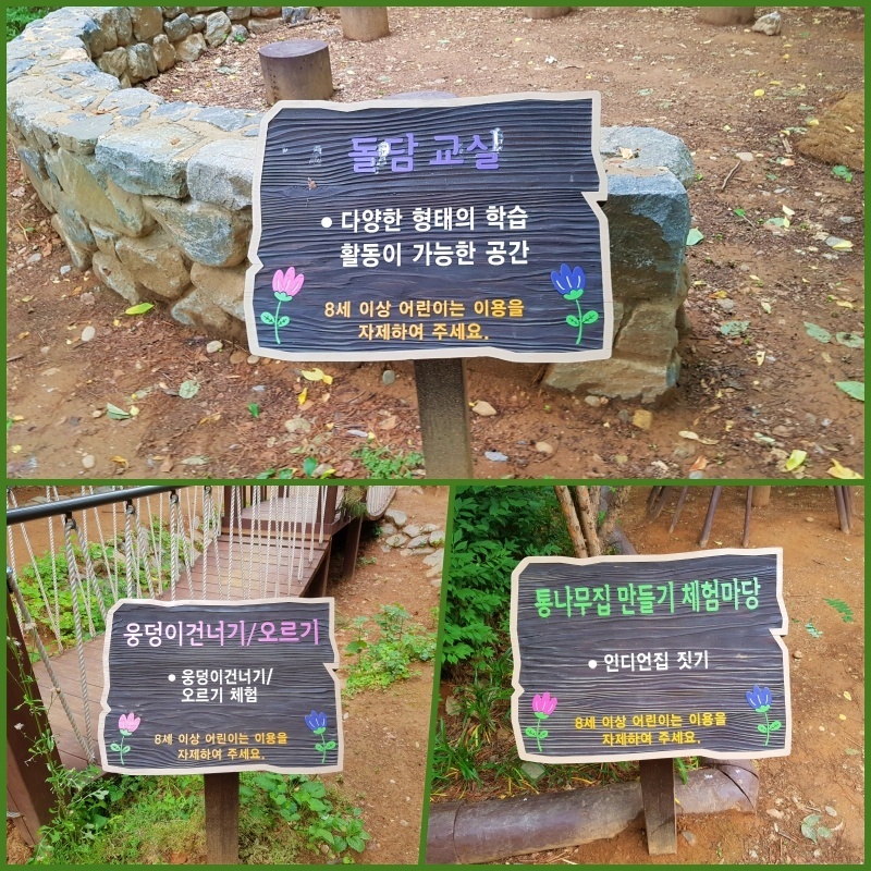유아 숲 체험장이 보입니다. 아이 눈높이에 맞춘 시설들이 보입니다.