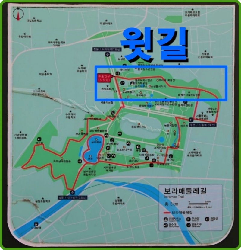 보라매 공원 외곽으로 도는 길인데요, 다 걸으면 1시간 조금 넘게 걸립니다. 오늘은 둘레길 윗길만 걸었습니다.