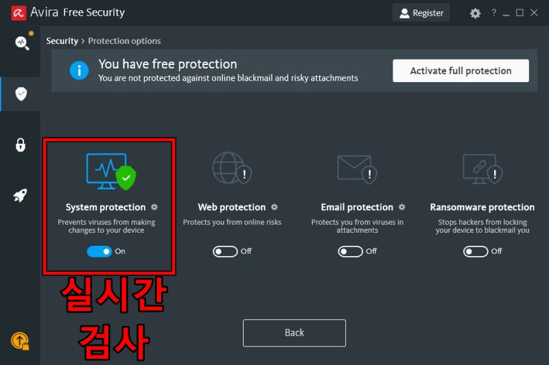 그런데, 가끔씩 크랙 프로그램 같은 걸 실행하려고 하면 아비라가 실시간 보호 기능으로 실행을 막는 경우가 있습니다. 그럴 경우에는 Avira의 실시간 보호 기능을 꺼야 합니다.