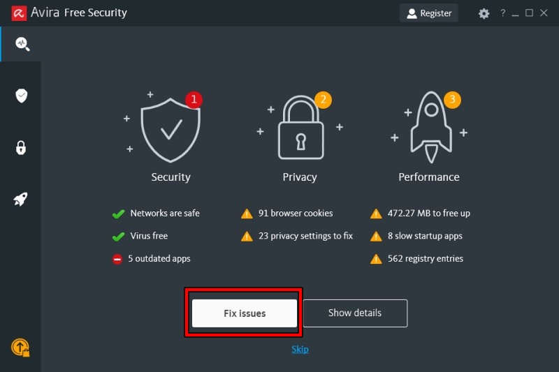 검사를 진행하면 이렇게 진행 과정을 아이콘으로 보여줍니다. 검사가 끝나면 보안, 개인정보, 컴퓨터 성능에서 어떤 문제가 있는지 알려줍니다. 저는 업데이트가 오래된 프로그램이 5개나 있다고 알려주네요. Fix issues를 클릭해서 문제를 해결합니다.