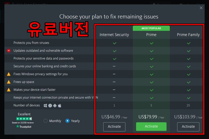 아비라의 제품은 크게 3가지로 나뉘어 있습니다. 무료 버전 1개와 유료 버전 2개가 있는데, 무료 버전만으로도 기본적인 백신 프로그램의 기능은 충분히 합니다.