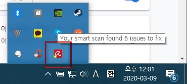 컴퓨터 오른쪽 하단에 △ 쪽 모양으로 화살표가 하나 있는데 그걸 클릭하면 이렇게 실행중인 프로그램 목록이 나옵니다. 여기서 Enable-Real Time Protection 기능을 해제하면 실시간 검사 기능이 꺼집니다.
