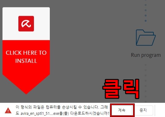 그러면 페이지가 넘어가고 왼쪽 하단에 다운로드가 뜰 겁니다. exe 파일이라서 다운받을 수 있냐고 물어보는데, 계속을 누릅니다. 이건 인터넷 브라우저가 크롬일 경우에 해당하고, 다른 인터넷 브라우저를 이용하면 다른 메시지가 뜰 겁니다. 어쨌든, 다운로드하면 됩니다.