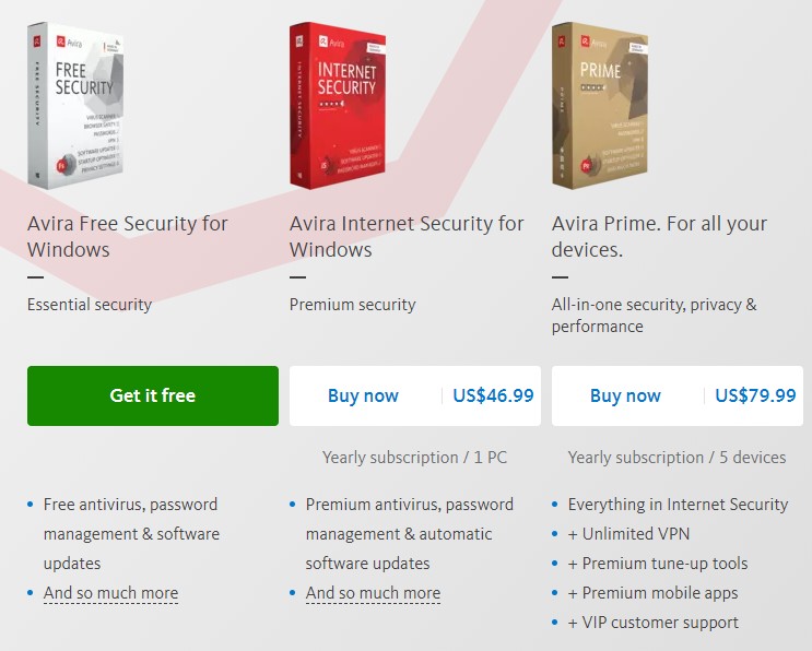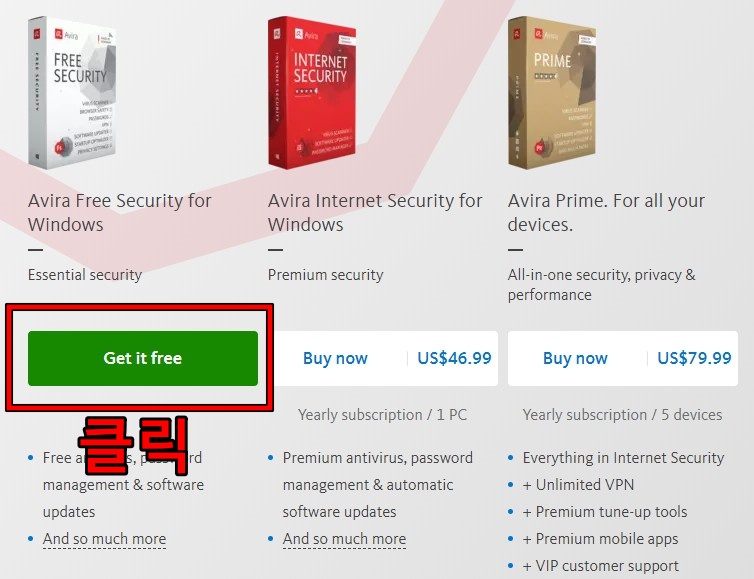 접속하면 이렇게 3개의 제품이 보일 텐데요, 우리는 무료 버전을 이용할 거니까, 맨 왼쪽의 Avira Free Security For Windows를 설치할 겁니다. 녹색의 Get it Free를 클릭합니다.