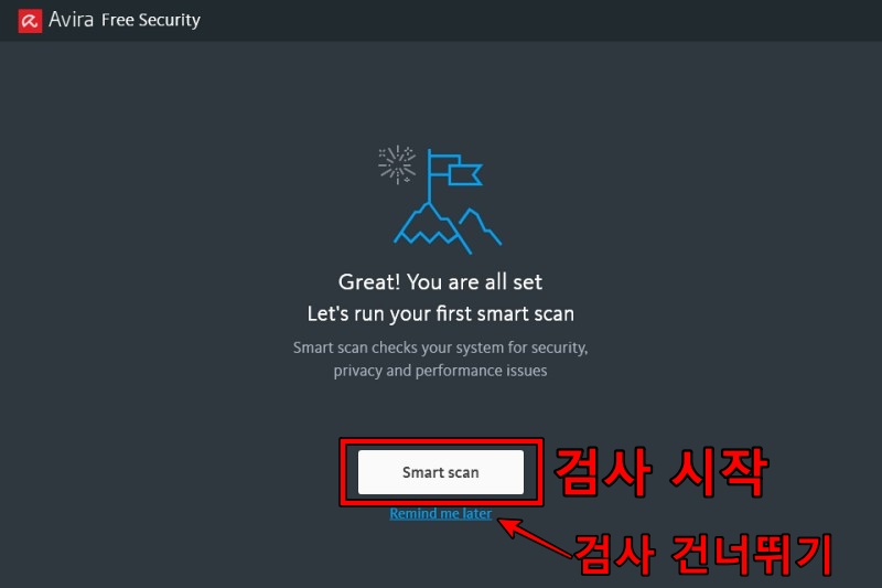 설치가 완료되면, 처음으로 바이러스 검사를 하겠냐고 물어봅니다. Smart scan을 클릭하면 검사를 시작합니다. Remind me later를 클릭해 검사를 건너뛸 수도 있습니다.