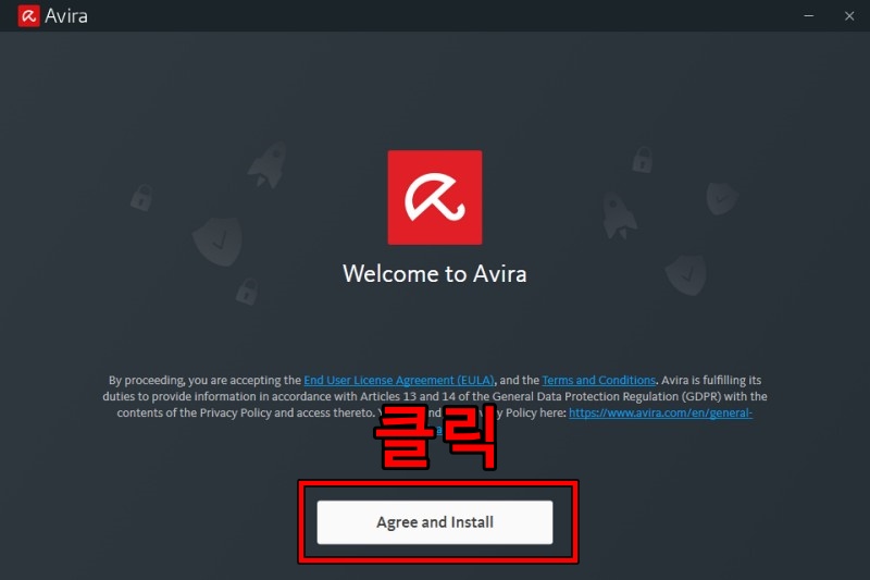 아비라 설치파일을 실행하면 영어로 뭐라 잔뜩 쓰여있습니다. 사용 약관에 동의한다는 내용이므로 신경 쓰지 않아도 됩니다. Aree and Install을 클릭해 설치를 시작합니다.