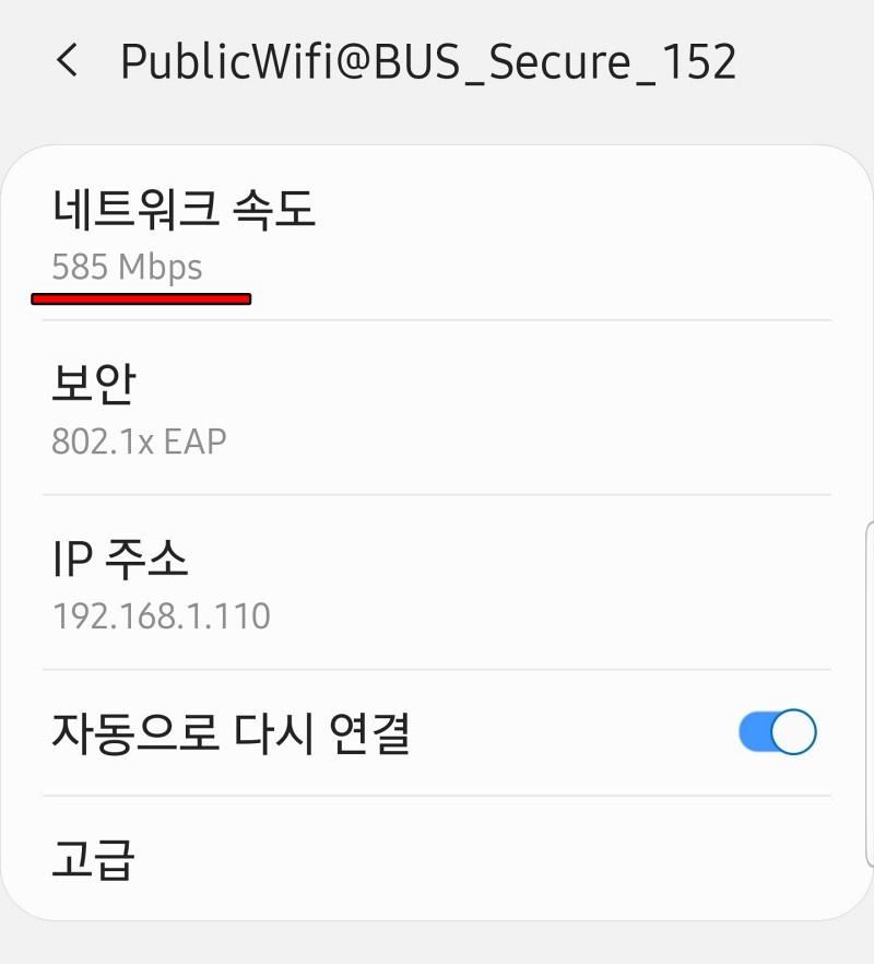 와이파이 네트워크 속도는 585Mbps가 나오네요. 와이파이 속도는 빠르고 잘 됩니다. 쓰는 사람이 많지 않아서 그런지 끊기는 일도 별로 없더군요. 지하철 와이파이보다도 잘 되는 것 같습니다.
