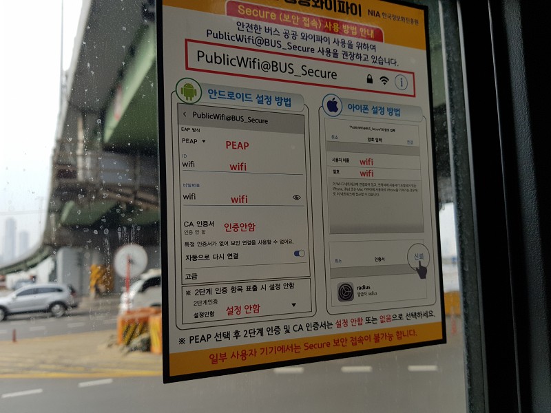 Sesure(보안접속) 사용 방법은 버스 창가에 붙어 있어서 그대로 따라하기만 하면 됩니다. 안드로이드와 아이폰의 설정 방법이 다르니 잘 보고 하시면 됩니다.