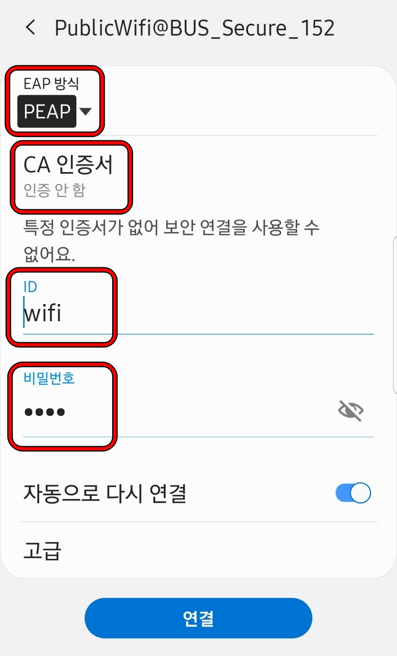 CA 인증서를 인증안함으로 설정합니다. ID는 wifi, 비밀번호도 wifi입니다. 2단계 인증 메시지가 나오면 2단계 인증을 설정 안 함으로 하면 됩니다.