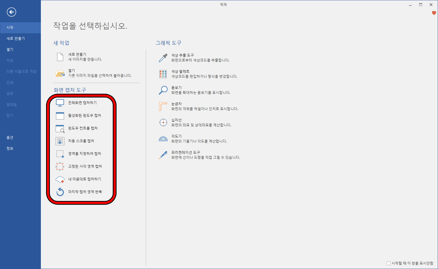 픽픽을 실행하면 다양한 방법으로 캡쳐를 할 수 있는 메뉴가 있습니다. 이걸로 컴퓨터 화면을 캡처할 수 있습니다.