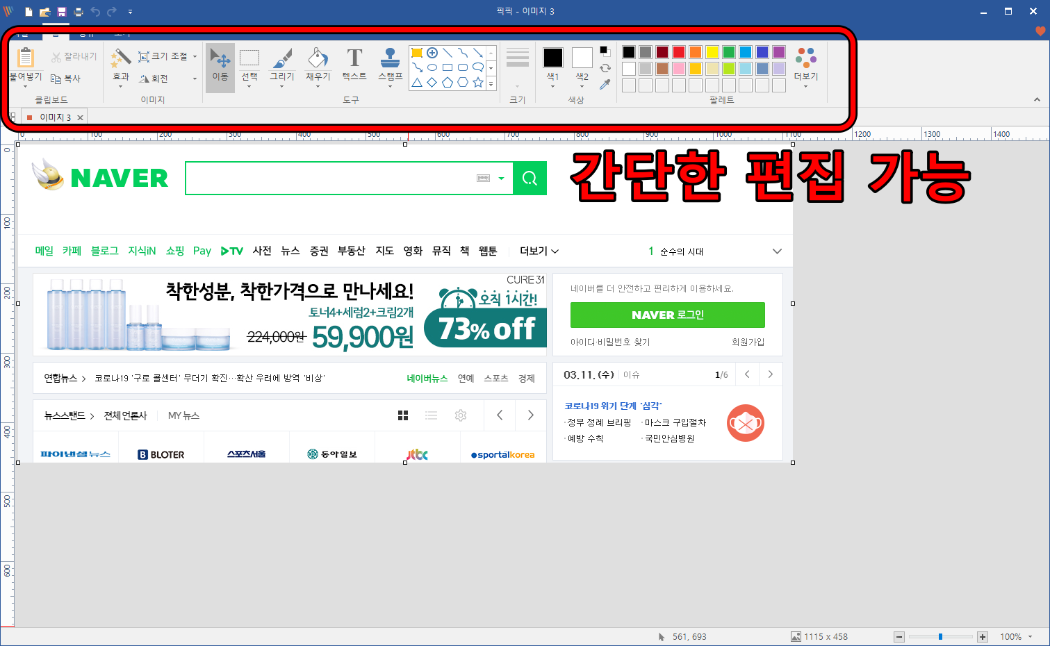 테스트로 네이버 홈페이지를 캡쳐했습니다. 캡처를 하면 픽픽 상단에 편집 기능이 있습니다. 이걸로 텍스트나 도형을 넣을 수 있습니다. 윈도의 오피스, 그림판과 같은 레이아웃이라서 쉽게 이용할 수 있습니다.