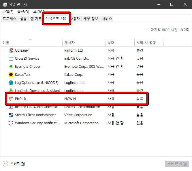 픽픽의 단축키 캡쳐 기능을 제대로 이용하려면 시작프로그램에 픽픽이 등록되어 있어야 합니다. 그렇지 않으면 시작할 때마다 픽픽을 실행시켜야지만 단축키 기능을 쓸 수 있습니다. 픽픽을 설치하면 기본으로 시작프로그램에 등록해주지만, 가끔씩 필요 없는 프로그램인 줄 알고 지우는 경우가 있으므로, 픽픽 단축키가 안 먹는다면 확인해 보는 게 좋습니다.