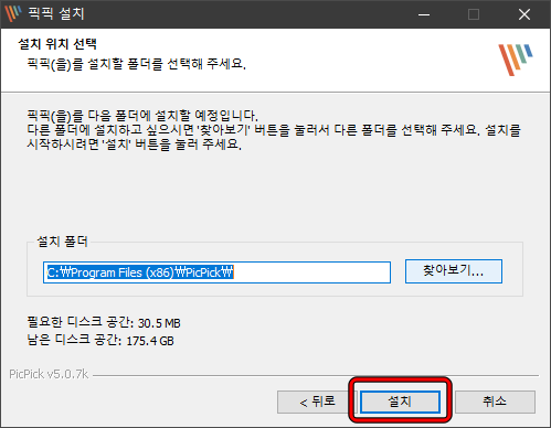 설치 경로 설정 화면입니다. 특별히 설치하고 싶은 곳이 없으면 설치를 클릭합니다.