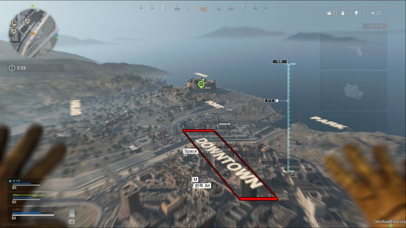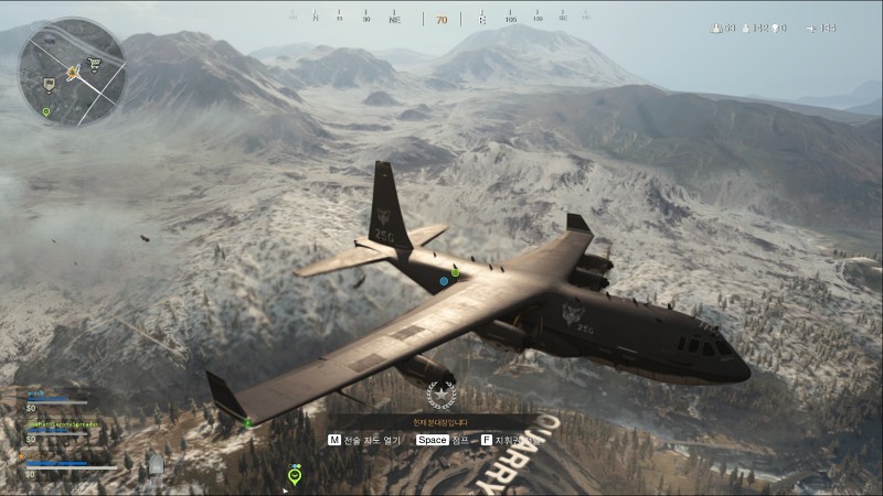 게임이 시작되면 배그처럼 비행기에서 사람들이 내립니다. 낙하산 타고 내려가는 중에, 텍스트로 지역명이 다 적혀 있었습니다. 직관적이어서 굳이 지도를 보지 않아도 되었습니다.