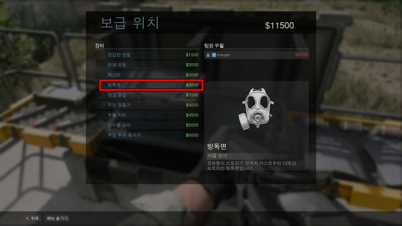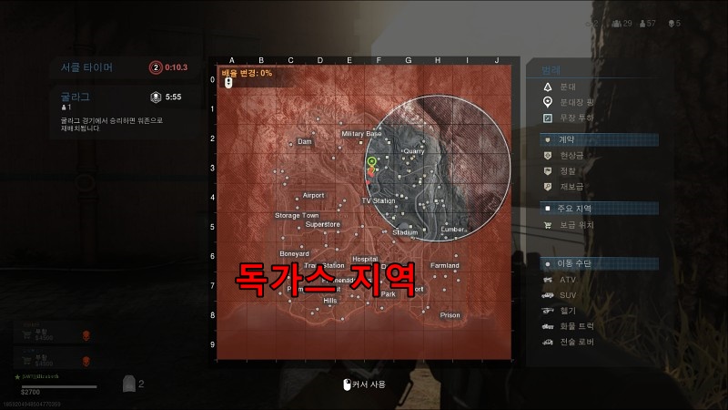 배그에 자기장이 있다면 워존에는 독가스가 있습니다. 싱글 플레이에서 나오던 그 독가스입니다. 독가스가 확산되는 속도는 자기장보다 빠릅니다. 독가스 지역에서 일정 시간 동안 있으면 죽습니다. 상점에서 가스 마스크를 파는데, 그걸 쓰면 독가스 지대에서도 10초 버틸 수 있습니다.