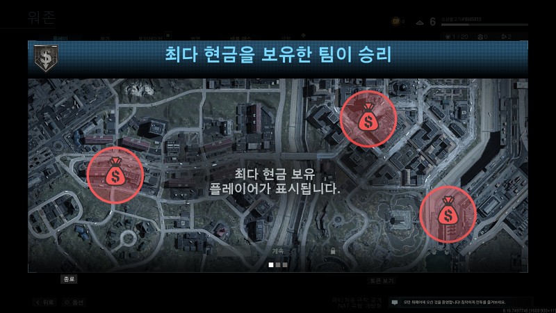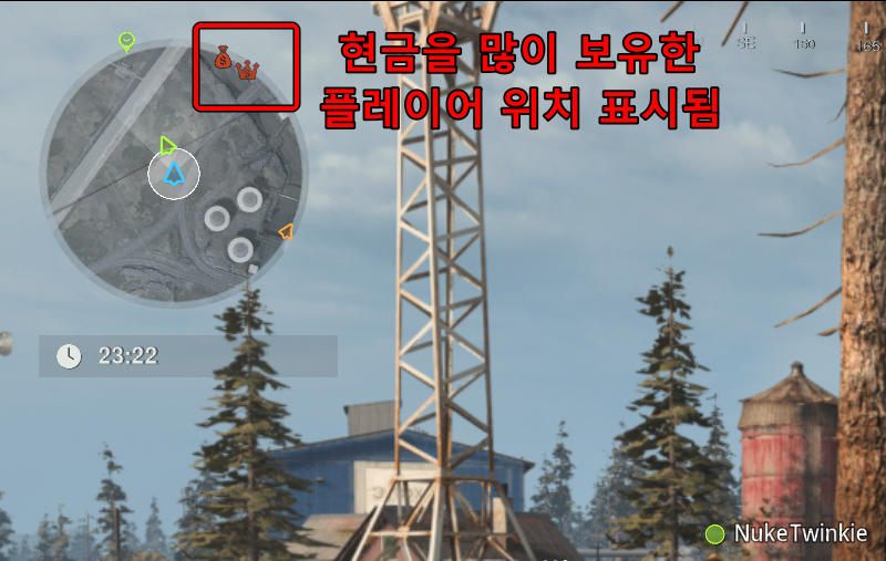 20분이 넘어가자 현금을 가장 많이 보유한 플레이어가 지도에 뜹니다. 이러니까 사람들이 전부 저 팀을 잡으려고 달려가더군요 ㅋㅋ 종료 시간에 가까워지면, 얻을 수 있는 현금의 양이 1.5배로 뜁니다. 그래서 상황에 따라, 순위가 바뀔 수도 있죠.