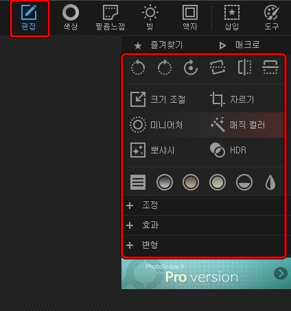 사진 편집은 이미지의 거의 모든 편집을 이용할 수 있습니다. 크기 조절, 자르기 등의 사이즈 관련 기능과, 매직 컬러 같은 사진 보정 기능을 주로 사용합니다. 특히 매직 컬러는 잘만 쓰면 보정을 잘 몰라도 색감이 확 살아나는 사진을 얻을 수 있어서 애용하고 있습니다.